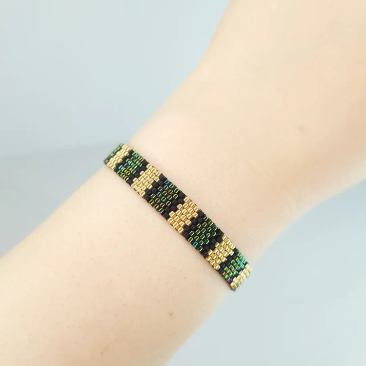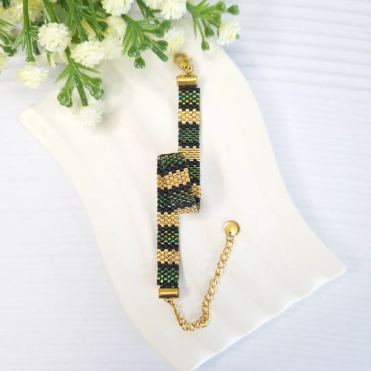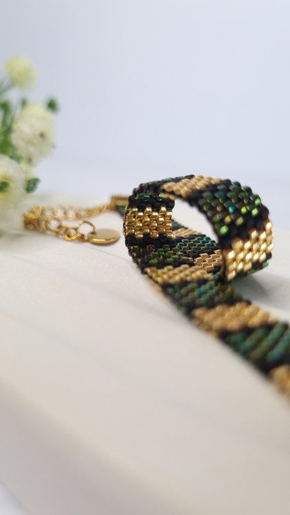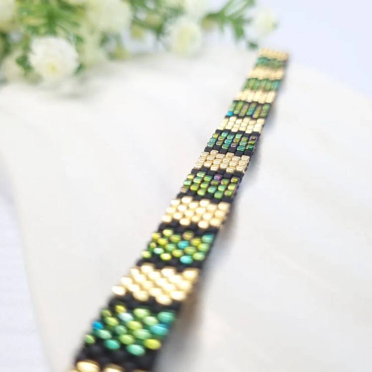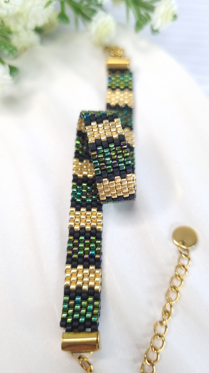 این دستبند منجوقی با استفاده از منجوقهای اصل ژاپنی Miyuki و با تکنیک بافت دستی ظریف ساخته شده است.