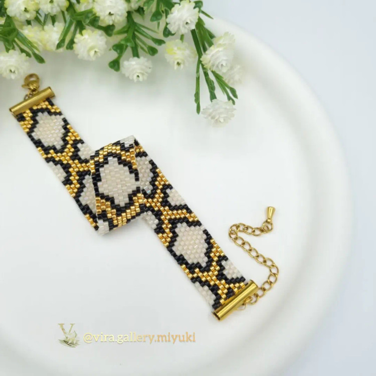 این دستبند زنانه با الهام از طرح پوست ماری و با استفاده از مهرههای اصل ژاپنی Miyuki Delica ساخته شده است.